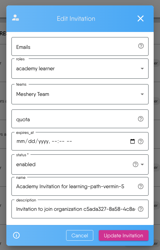 1. Name: Automatically formatted as “Academy Invitation for [your-content-name]” Example: “Academy Invitation for meshery-contributors-certification” (lowercase with dash)